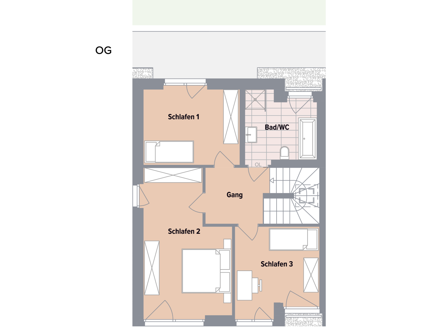 1. Obergeschoss: Vorraum, 3 Schlafzimmer, Badezimmer mit Wanne, Dusche und WC.