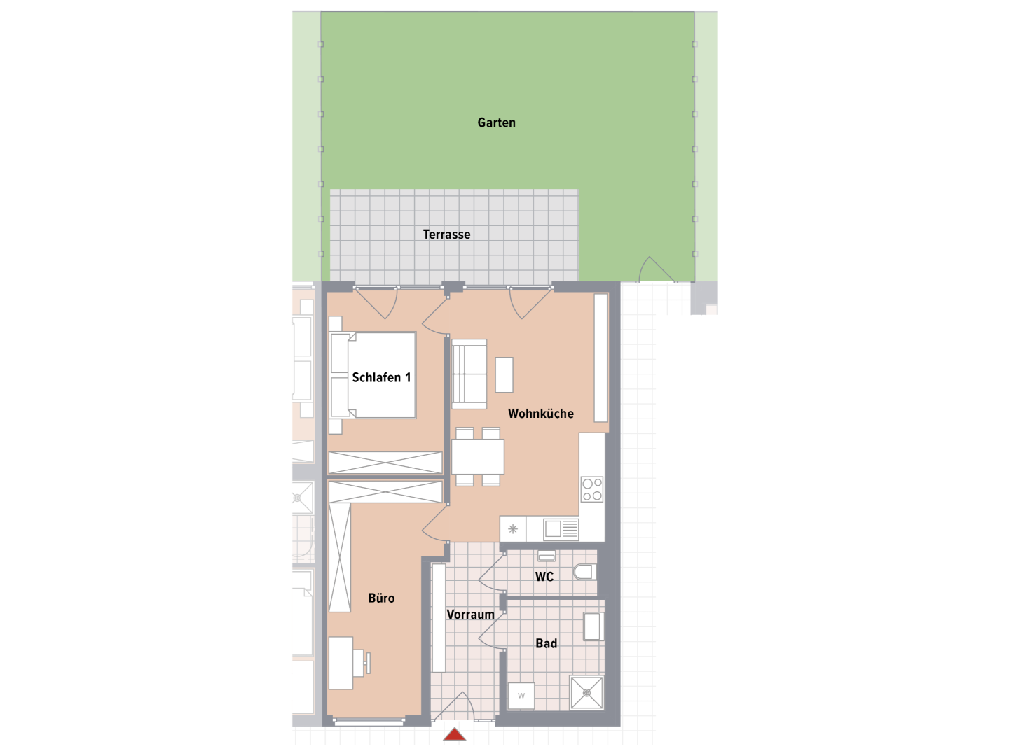Das Highlight ist der großzügige Außenbereich: eine 12,03 m² große Terrasse sowie ein eingezäunter Eigengarten mit 40,73 m², der viel Platz zum Entspannen, Spielen und Garteln bietet. Alle Wohnungen werden hochwertig mit Eichenparkett, Feinsteinzeugfliesen sowie Raffstores (Sonnenschutz) ausgeführt.