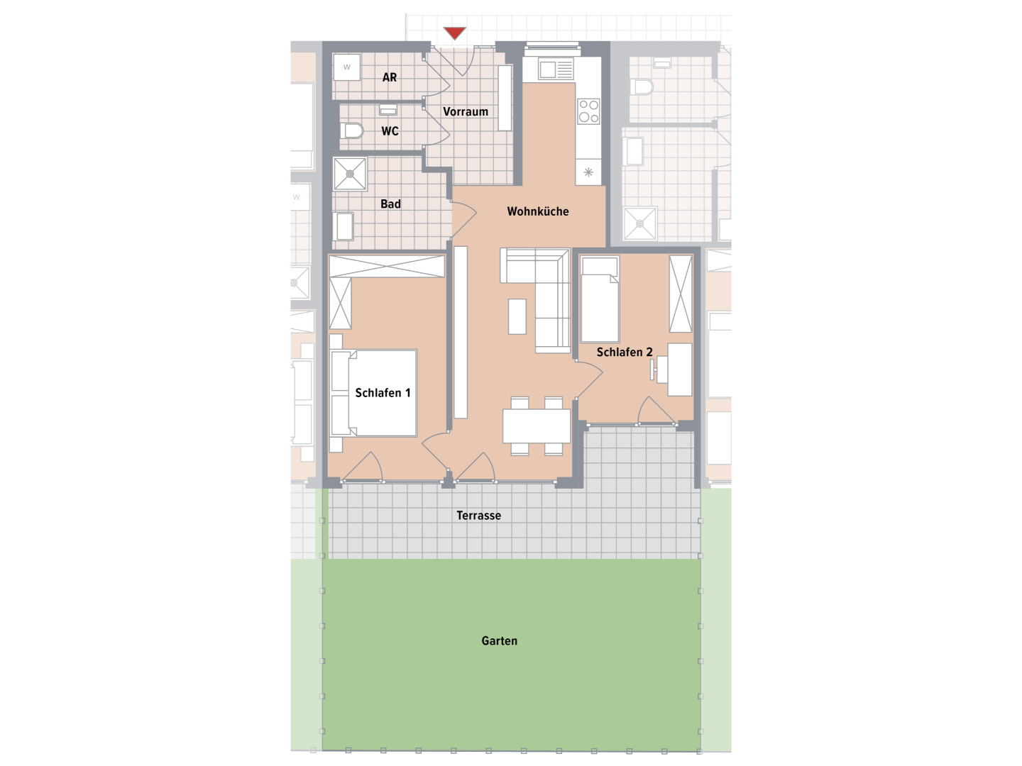 - Jede Einheit mit Balkon oder Terrasse mit Eigengarten