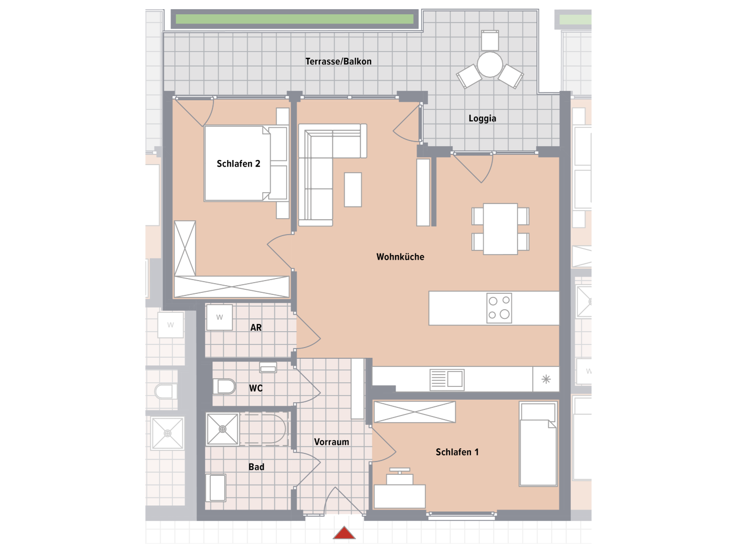 - Jede Einheit mit Balkon oder Terrasse mit Eigengarten