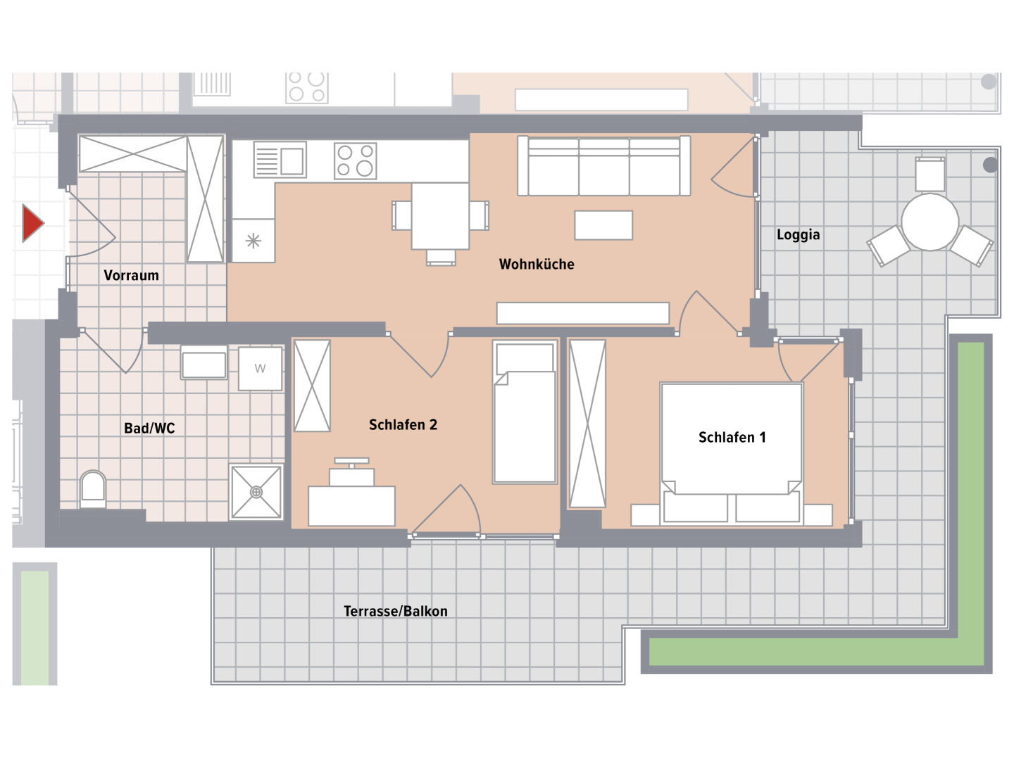 - Jede Einheit mit Balkon oder Terrasse mit Eigengarten