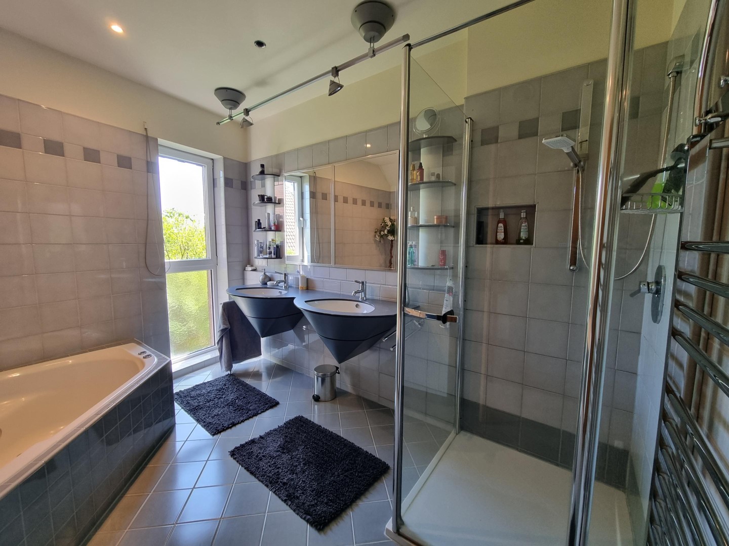 - Badezimmer mit Eckbadewanne und Dusche