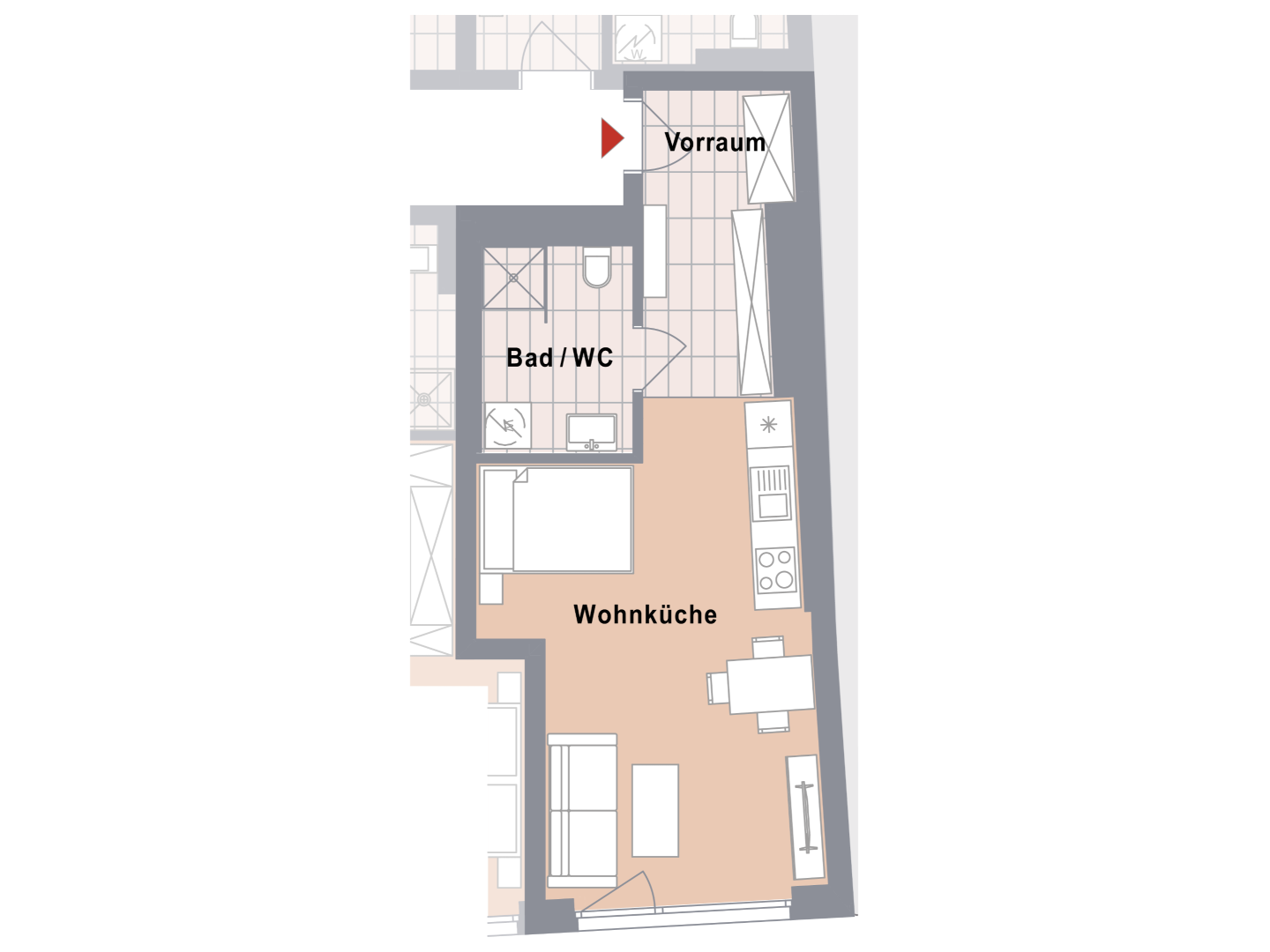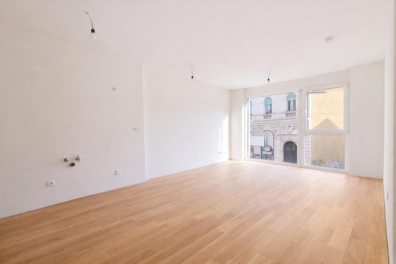 Diese ca. 37m² große 1-Zimmerwohnung befindet sich im ersten Stock und verfügt über große bodentiefe Fensterflächen.
